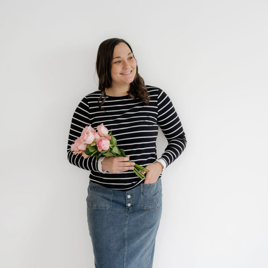 The Pauline Striped Top is a classic black-and-white long sleeve knit with a feminine ruffled cuff detail. It’s an easy, modest piece you can dress...