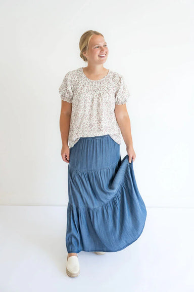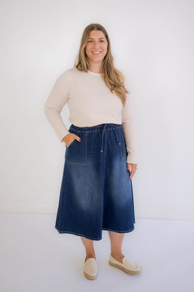 The Martha skirt is a timeless denim skirt with a comfortable elastic drawstring waist. The skirt falls to the ankle, with a ruffle hem for a femin...