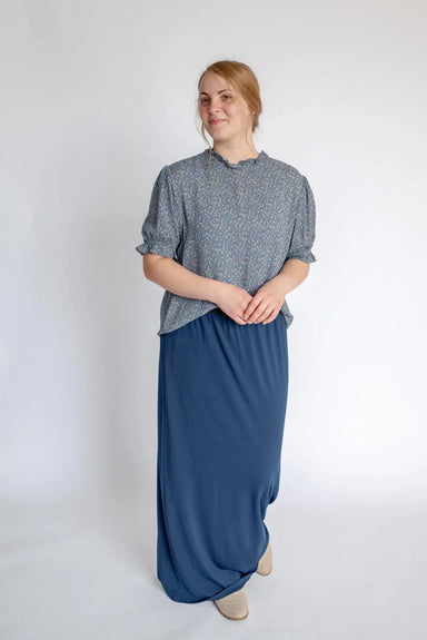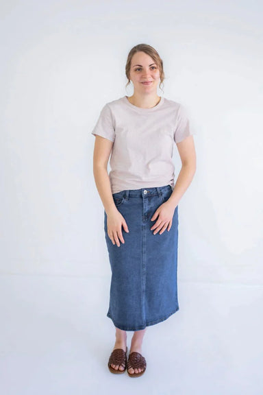 A simple twist on a classic denim skirt, the Elsie was designed for practical comfort and a modest fit. Featuring lightweight stretch denim, a no-r...