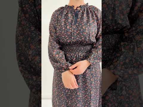 - Style: smocked waist, fully lined, tiered hem, long sleeves with gathered cuff, tie neckline