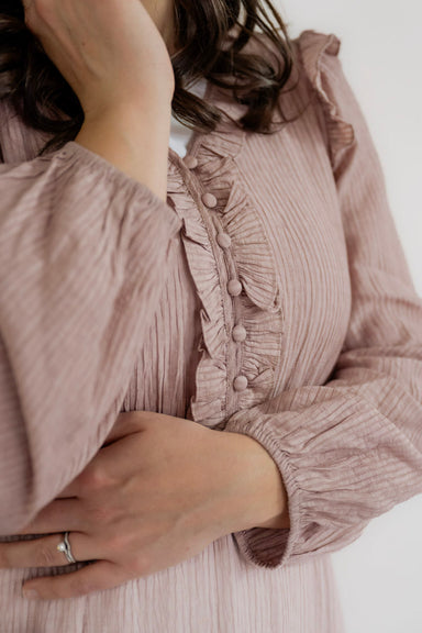 The Shaye Dress in Mauve features a gentle silhouette with soft, feminine details. Its gentle bottom tier and ruffled accents make it an easy and g...