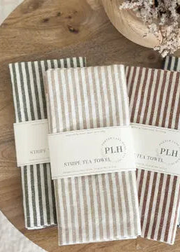 Elevate your kitchen with our curated linen tea towel set, featuring a sophisticated blend of pinstripe and cabana stripe patterns in earthy hues o...