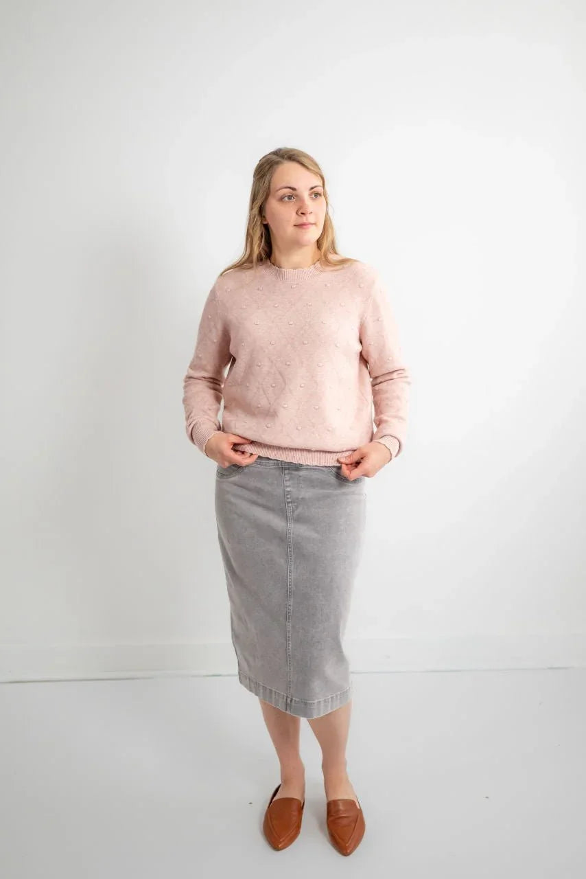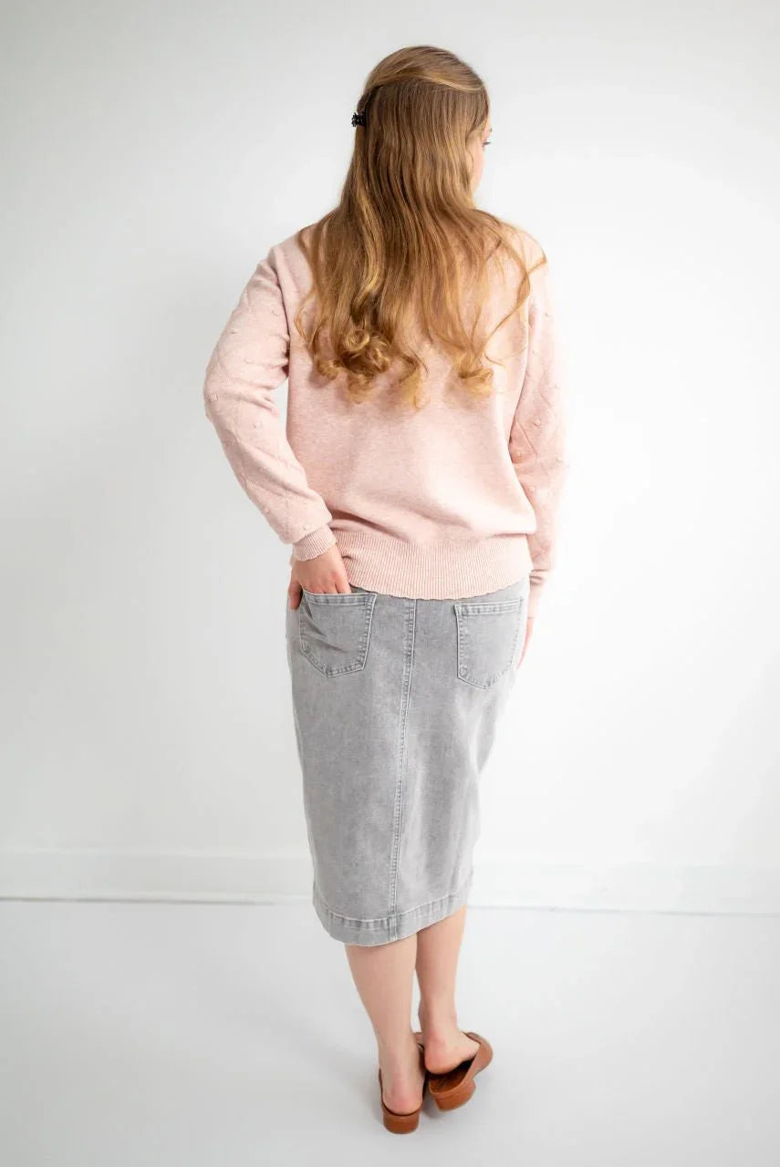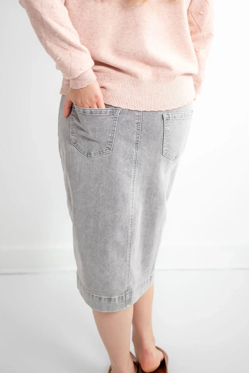 This soft denim skirt has a vintage wash for that lived in look we love. It is made from a quality, stretch denim to ensure a modest and flattering fit. Featuring a wide waistband for extra comfort and easy styling. This skirt was designed with everyday wear in mind and will pair well with just about any casual top in your wardrobe!