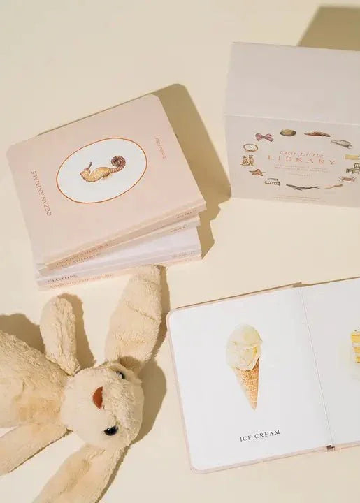Designed by a professional watercolor artist and licensed speech therapist, Our Little Library Vol. 2 includes five new board books that feature charming watercolor illustrations and foundational first words that will help you build your child's vocabulary. The durable materials and small book size also make them perfect for your baby's little hands.