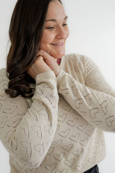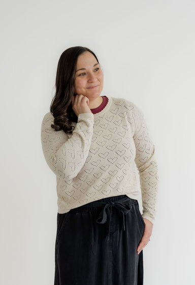 The Cadence Heart Pointelle Sweater in Cream is a sweet, easy-to-wear layer for every day. Soft pointelle hearts and a scalloped neckline add quiet...