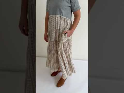 • Style: maxi length, tiered floral skirt, soft tee-style knit bodice, modest crew neckline, cuffed short sleeves