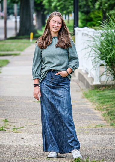 The Reese Denim Maxi Skirt in Dark Wash is a practical and versatile skirt, perfect for any season! This full-length skirt, without a slit, ensures...