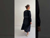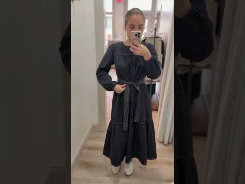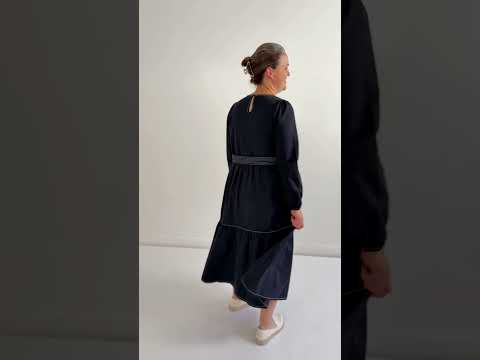 - Style: midi dress with long sleeves, waist tie, contrast stitching, pockets