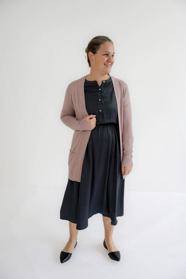 The Louise Cotton Blend Cardigan in Mauve is a soft, mid-weight open-front layer with ribbed trim and front patch pockets, offering a relaxed, comf...