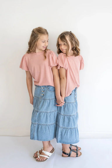 This Denver Girls Tiered Denim Skirt features a button-front design and tiered layers for a charming look! It includes functioning pockets for conv...
