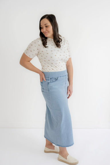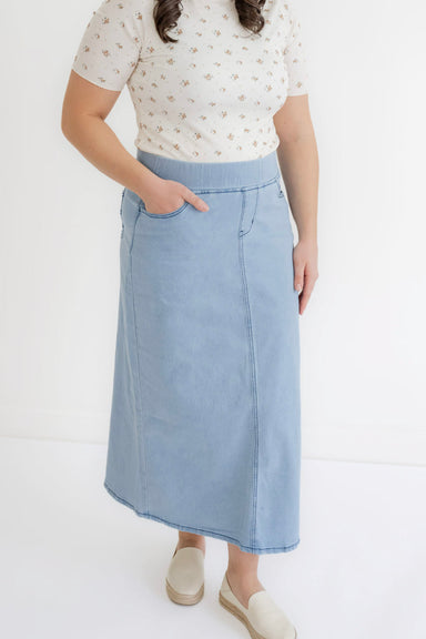 Modest casual comfort is this ankle length denim skirt! The 'Rosemary' features a non-bulky elastic waistband in a medium-weight, lightwash denim w...