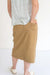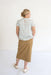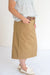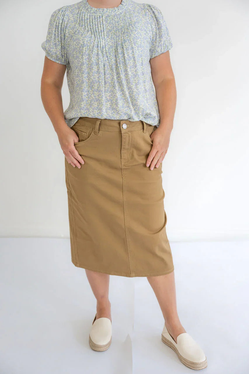 The Eliza Midi Skirt in khaki twill is cut in a gentle a-line with no slit - but with enough stretch to give it great walkability! Bonuses include functioning front and back pockets, and top-stitching details, front button closure and a classic color that will go with all your tops! This is an easy-going everyday skirt that can be easily elevated for church events, heading out to date night, or for that parent meeting at school!