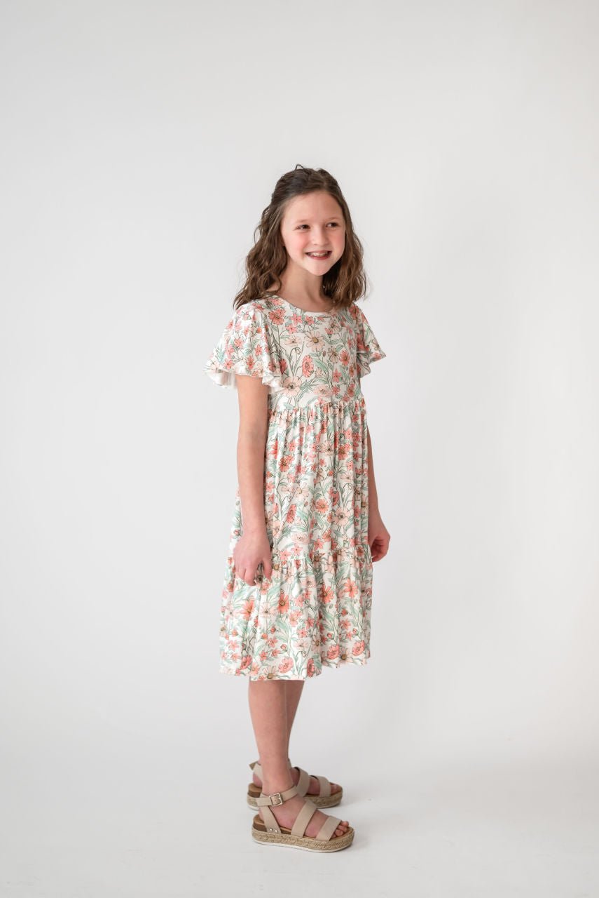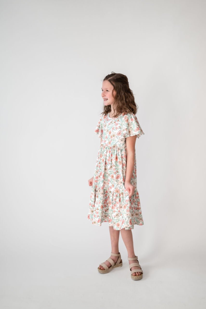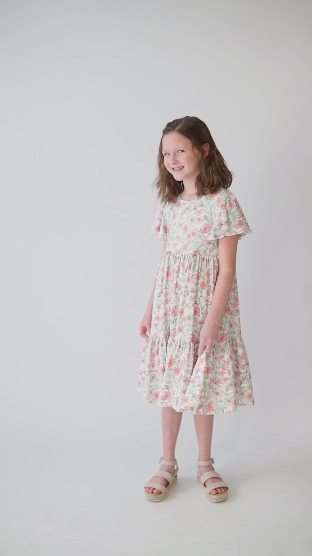 The Olivia is a butter-soft knit dress. This best-seller is comfortable enough for any little lady's active lifestyle, yet sweet enough to wear to Sunday School when paired with sandals and a hairbow. Flutter sleeves and a deep ruffled hem add the sweetest feminine details.