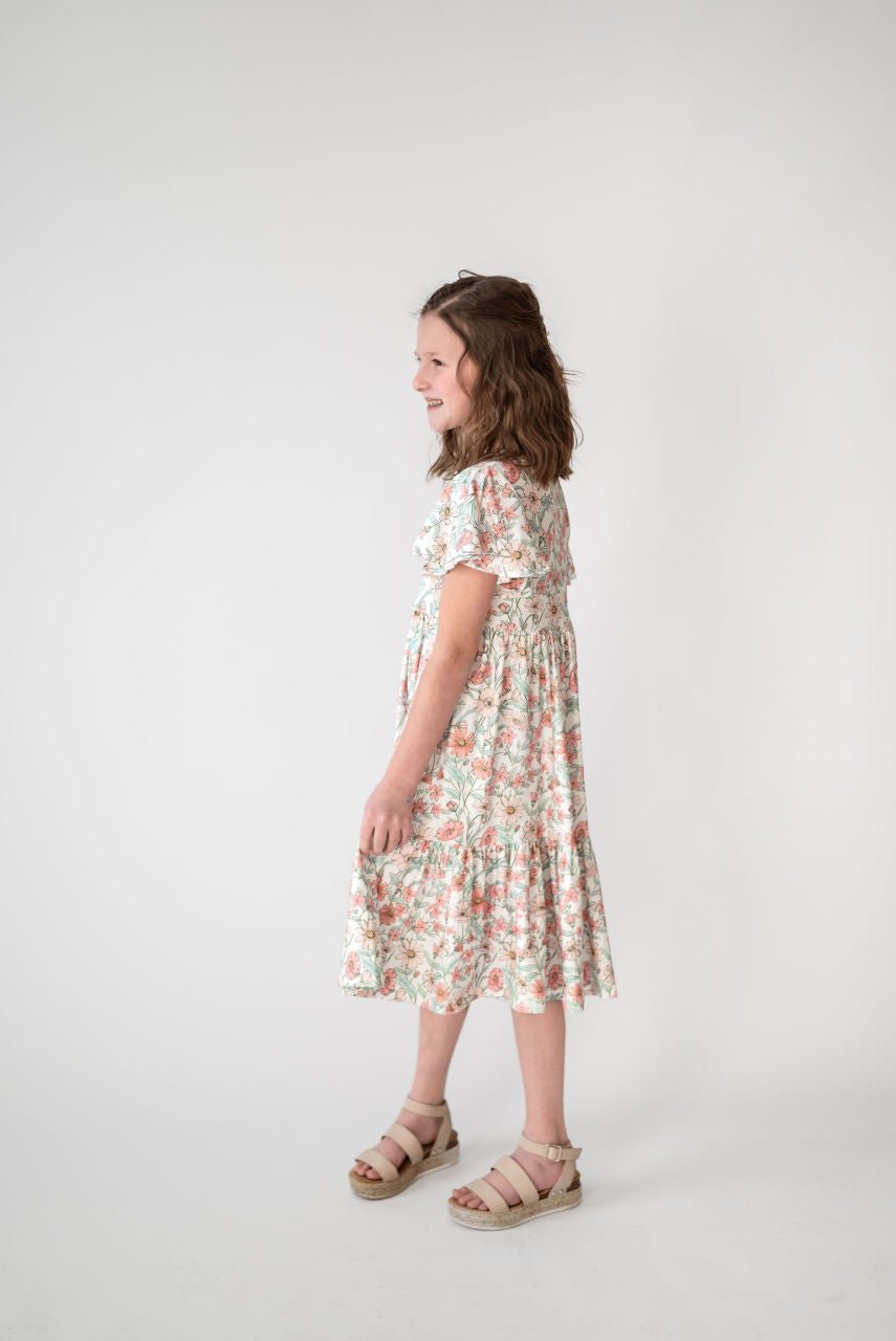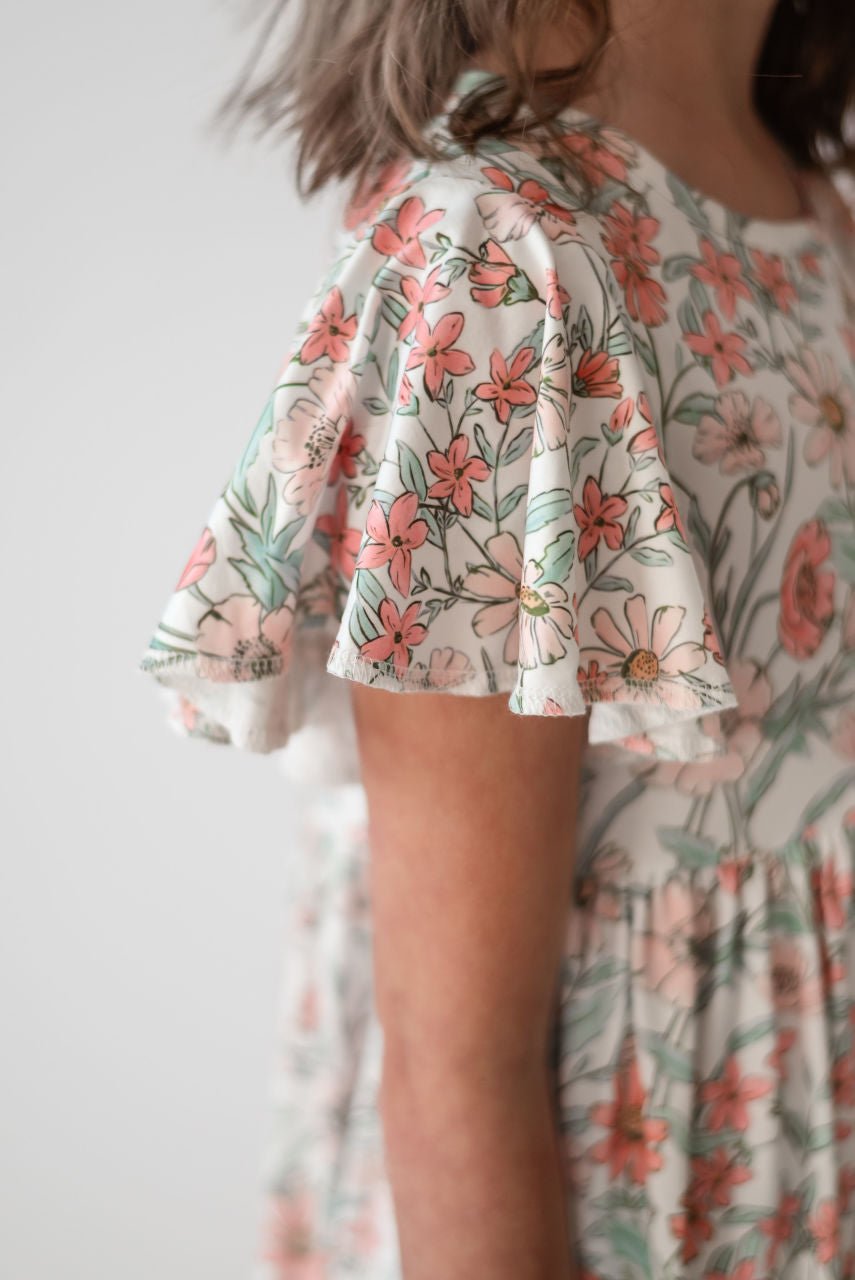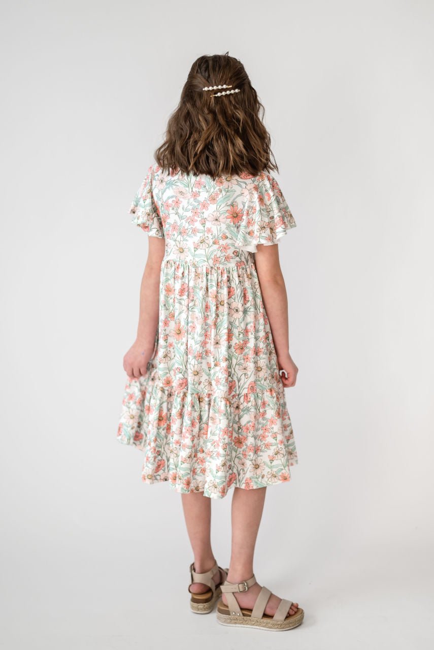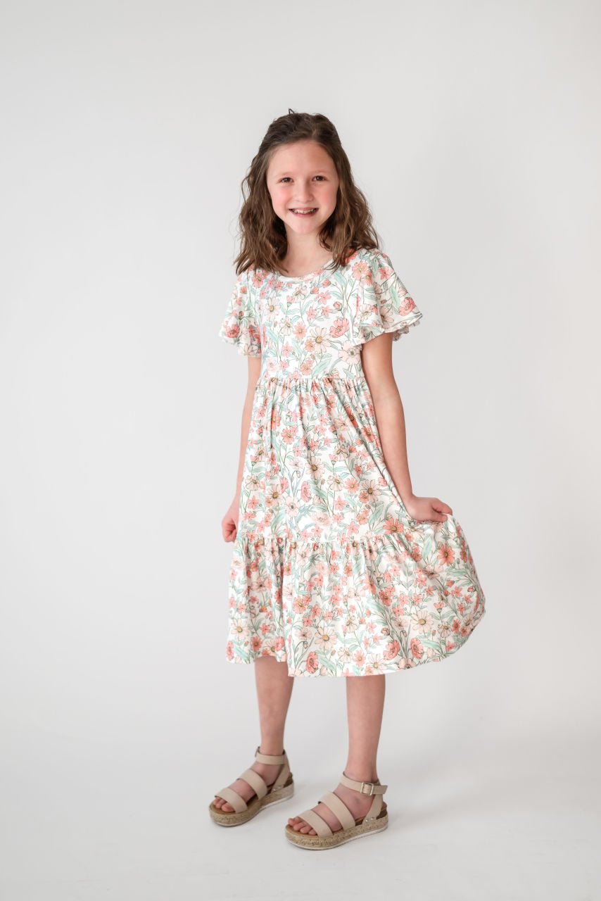 The Olivia is a butter-soft knit dress. This best-seller is comfortable enough for any little lady's active lifestyle, yet sweet enough to wear to Sunday School when paired with sandals and a hairbow. Flutter sleeves and a deep ruffled hem add the sweetest feminine details.