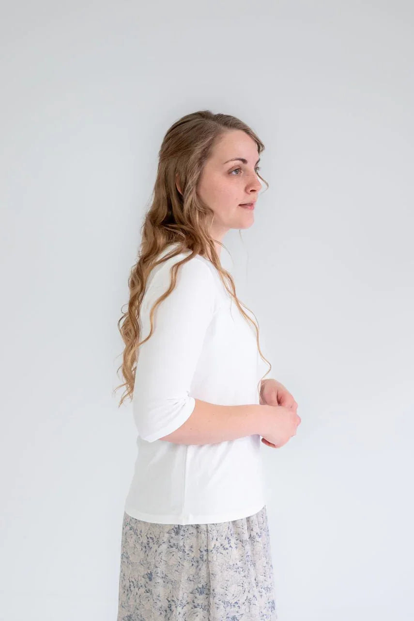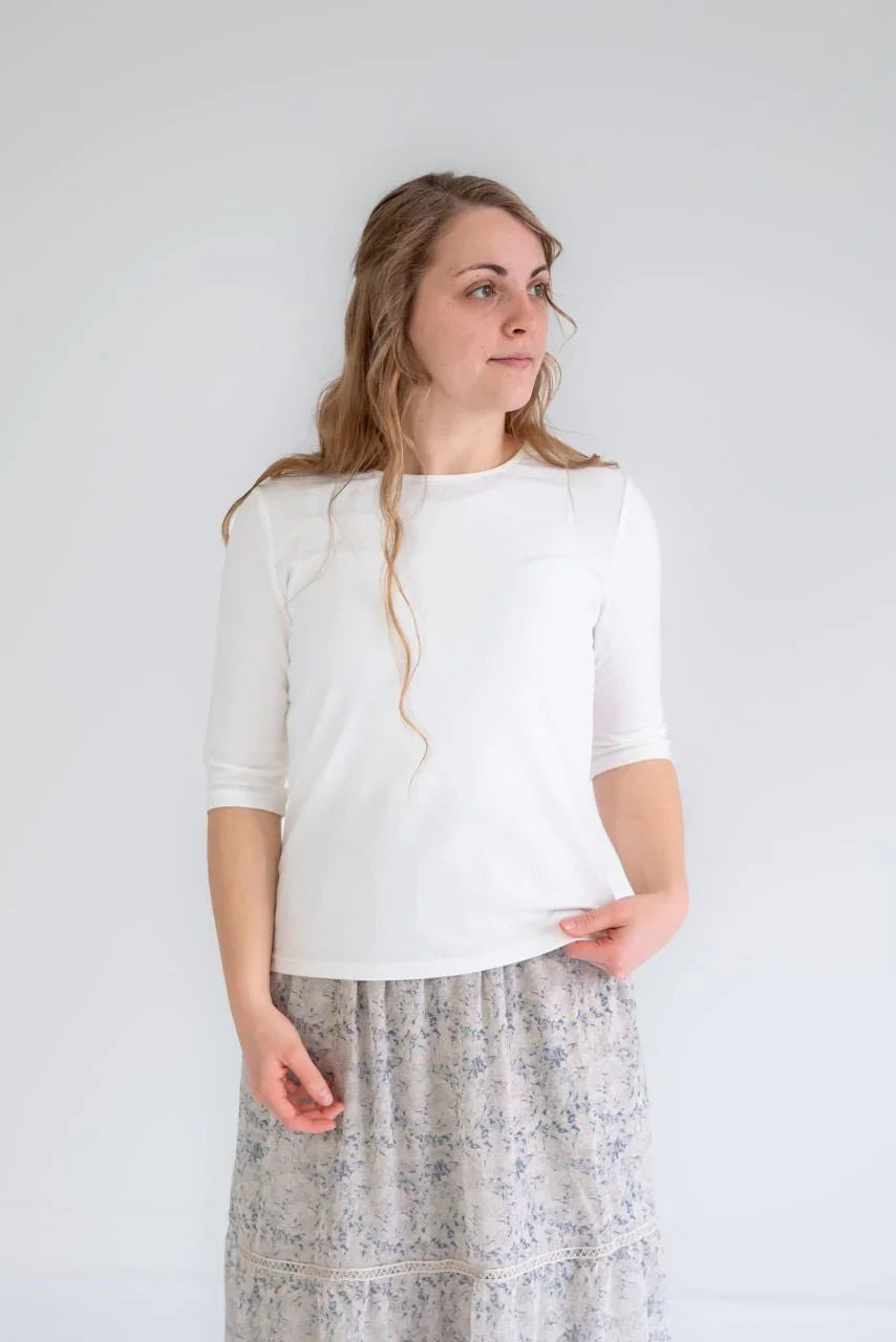 The Odette Essential Half-Sleeve Top in ivory is the perfect wardrobe staple for changing seasons! With half sleeves, a modest pull-over neckline - and luxuriously smooth knit fabric, it adds a touch of simple sweetness to any outfit. Wear it alone or layer it for a versatile and effortless look.