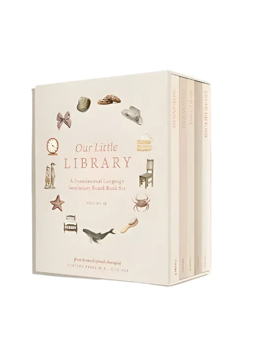 Designed by a professional watercolor artist and licensed speech therapist, Our Little Library Vol. 2 includes five new board books that feature charming watercolor illustrations and foundational first words that will help you build your child's vocabulary. The durable materials and small book size also make them perfect for your baby's little hands.
